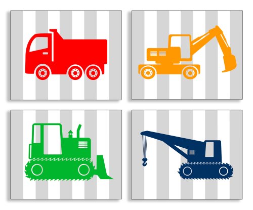 The Kids Room By Stupell Construction Vehicles On Gray Stripes 4-Pc. Rectangle Wall Plaque Set, Proudly Made in USA